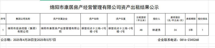 綿陽(yáng)市康居房產(chǎn)經(jīng)營(yíng)管理有限公司資產(chǎn)出租結(jié)果公示