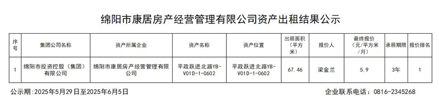 綿陽市康居房產經營管理有限公司資產出租結果公示