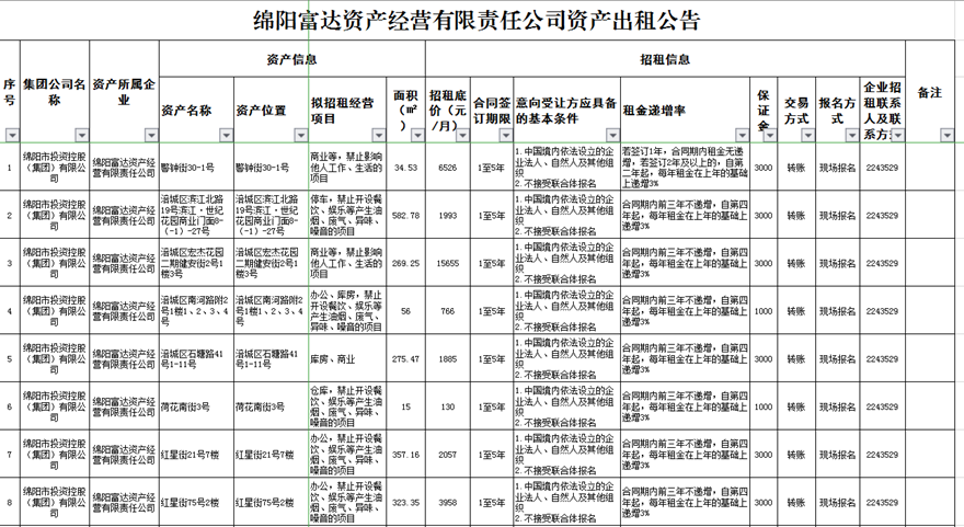 綿陽富達資產(chǎn)經(jīng)營有限責任公司資產(chǎn)出租公告