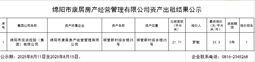 綿陽市康居房產(chǎn)經(jīng)營管理有限公司資產(chǎn)出租結(jié)果公示
