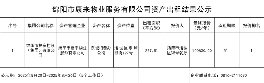 綿陽(yáng)市康來(lái)物業(yè)服務(wù)有限公司資產(chǎn)出租結(jié)果公示