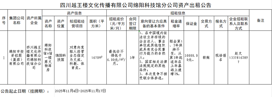 四川越王樓文化傳播有限公司綿陽科技館分公司資產(chǎn)出租公告