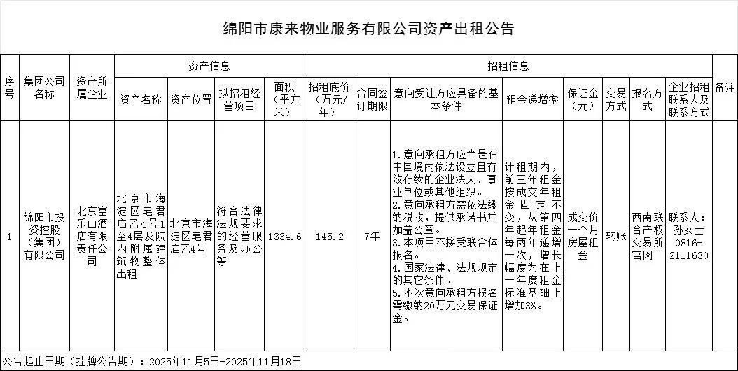 綿陽市康來物業(yè)服務有限公司資產(chǎn)出租公告