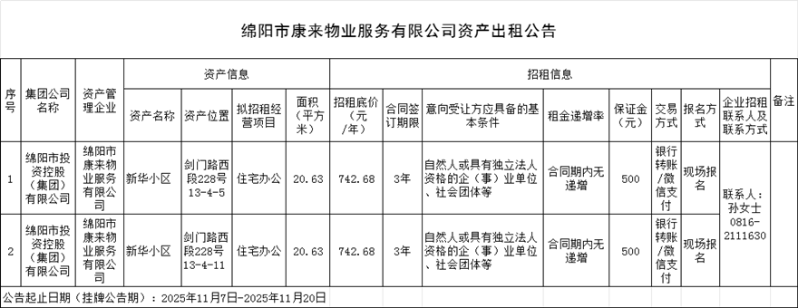 綿陽市康來物業(yè)服務有限公司資產出租公告