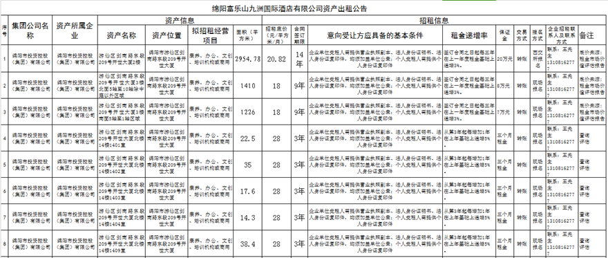 綿陽富樂山九洲國際酒店有限公司資產(chǎn)出租公告
