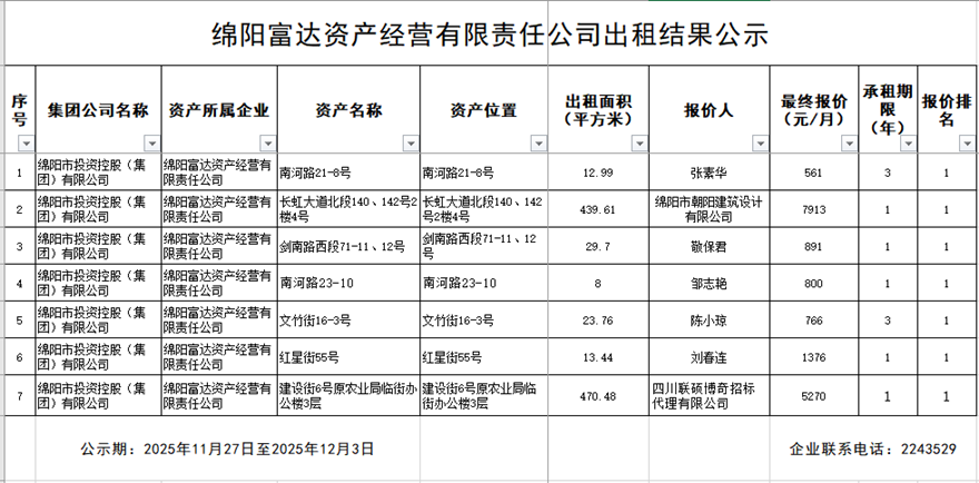 綿陽(yáng)富達(dá)資產(chǎn)經(jīng)營(yíng)有限責(zé)任公司出租結(jié)果公示
