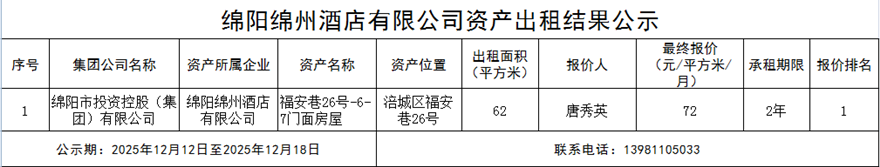 綿陽綿州酒店有限公司資產(chǎn)出租結(jié)果公示