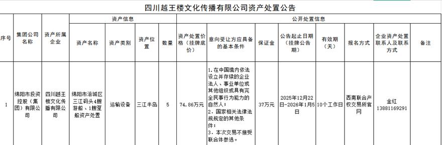 四川越王樓文化傳播有限公司資產(chǎn)處置公告