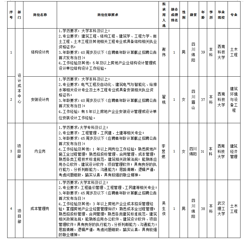 【公開招聘】綿陽市綿投置地有限公司關(guān)于結(jié)構(gòu)設(shè)計崗等崗位擬錄用人選的公示