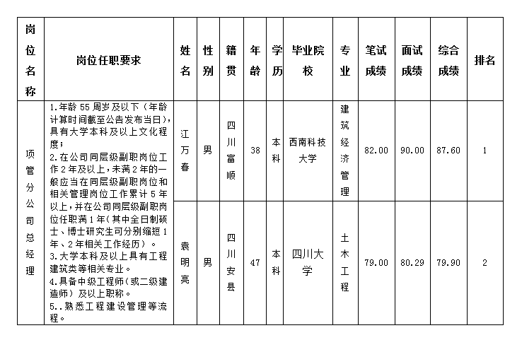 根據(jù)四川嘉來建筑工程有限公司發(fā)布的延長項目管理分公司總經(jīng)理崗位報名時間的公告及相關(guān)規(guī)定,經(jīng)筆試、面試等程序,現(xiàn)將綜合成績予以公示。