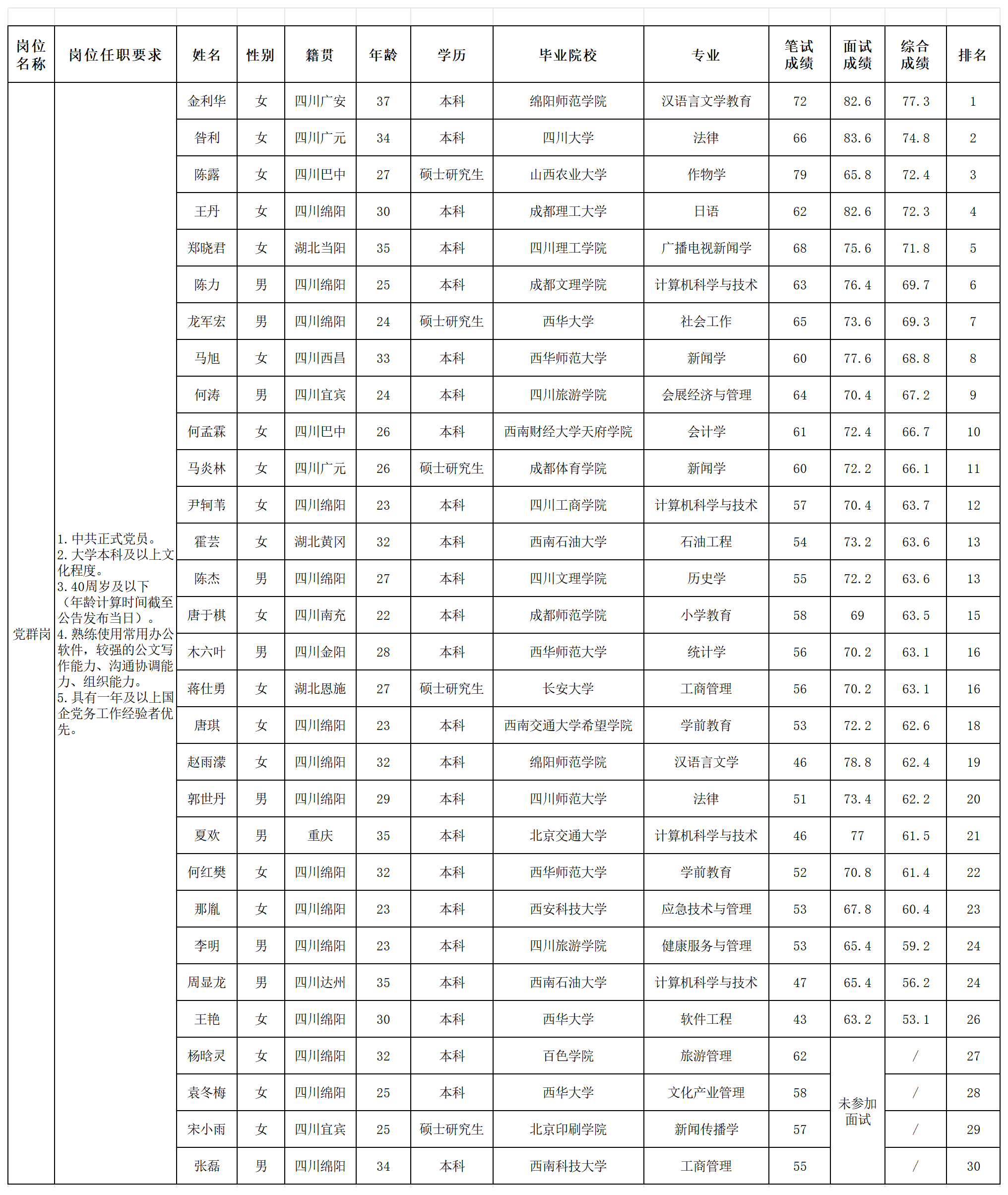 根據(jù)四川越王樓文化傳播有限公司發(fā)布的招聘公告及招聘相關規(guī)定,經筆試、面試等程序,現(xiàn)將筆試(面試)成績予以公示。