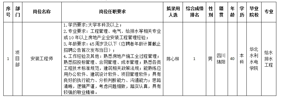 【公開招聘】綿陽市綿投置地有限公司關(guān)于招聘安裝工程師崗位擬錄用人員的公示