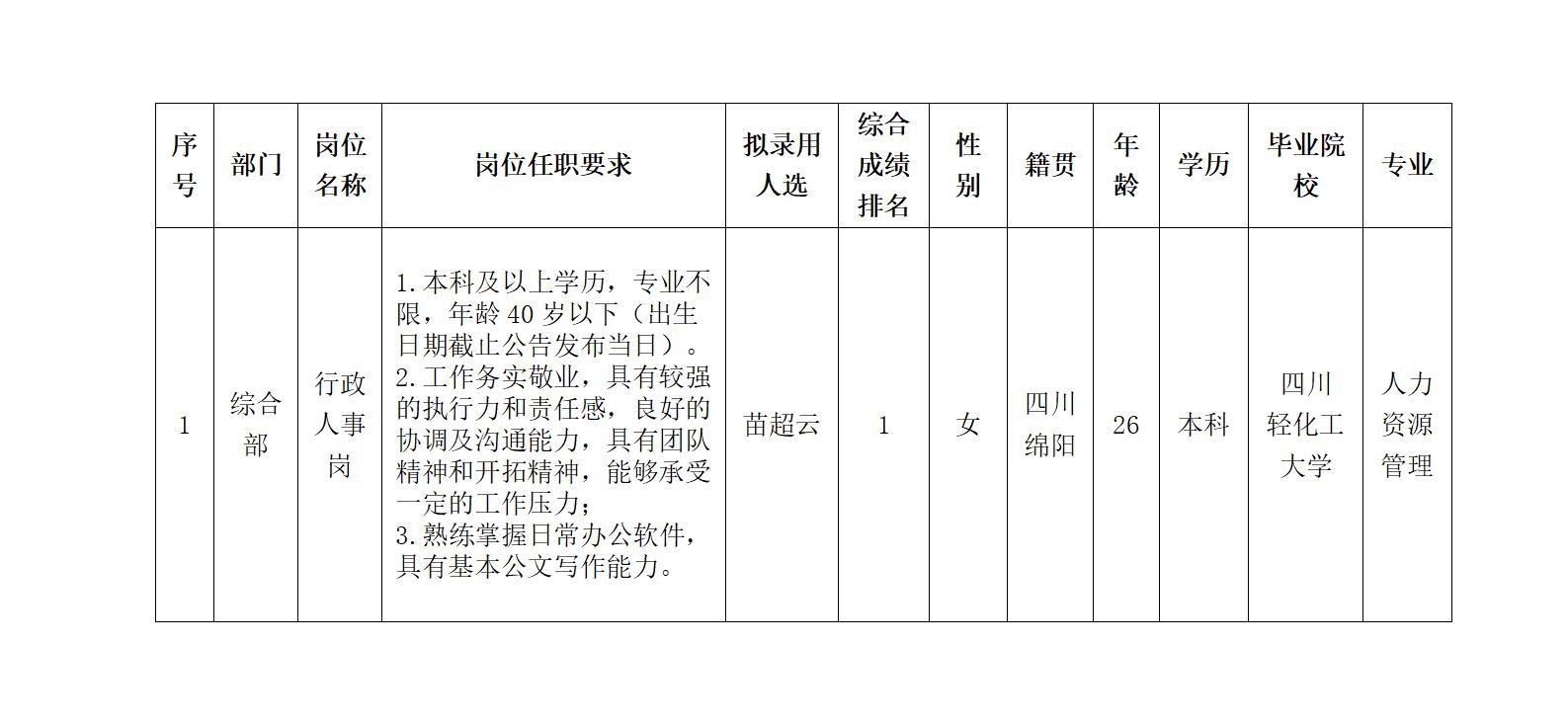 【公開招聘】四川綿江能源有限公司 關(guān)于招聘行政人事崗位擬錄用人員的公示