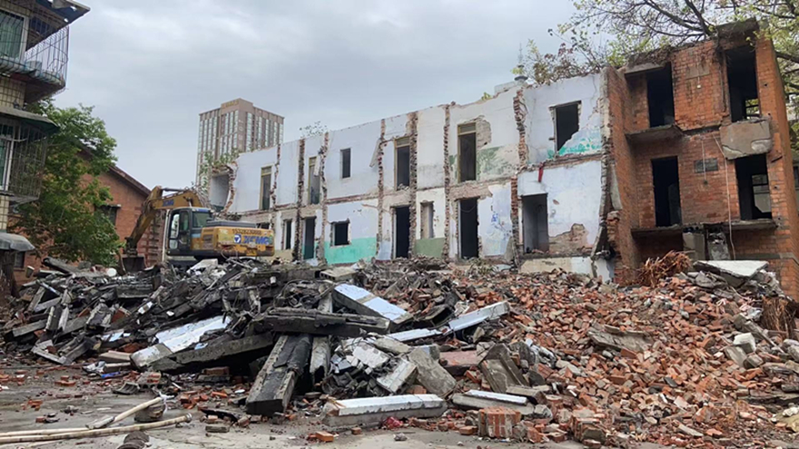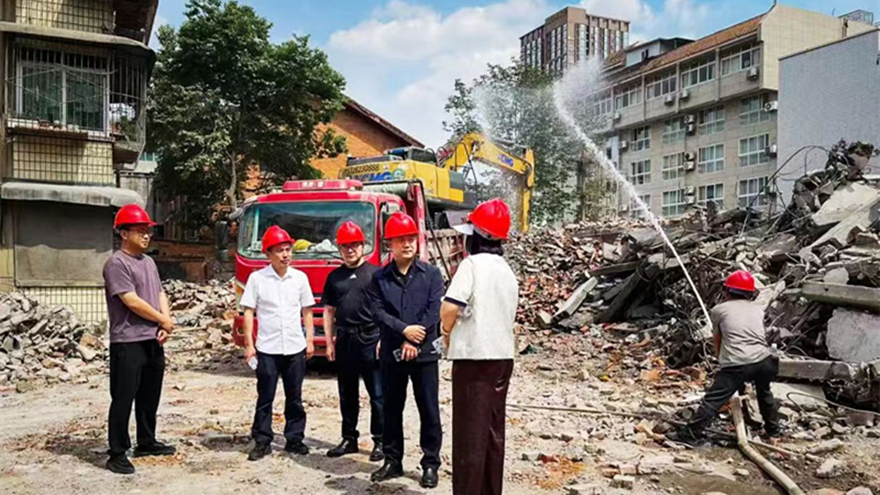 危房緊鄰周邊住宅,施工空間狹小,拆除難度極大。為確保拆除工作安全有序進行,富達公司多次組織建筑、安全專家現(xiàn)場勘查,研究制定了“機械拆除為主,人工配合為輔”的精細化拆除方案。拆除現(xiàn)場,工作人員設置警戒線封鎖拆除區(qū)域,專人疏導圍觀群眾,維護現(xiàn)場秩序。伴隨著挖掘機的轟鳴聲,危房樓體結構在專業(yè)人員的精準操控下逐步瓦解,同步實施灑水降塵措施,整個拆除過程安全、有序、環(huán)保。